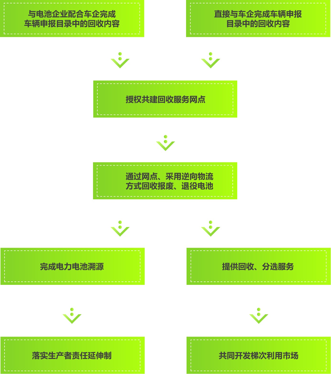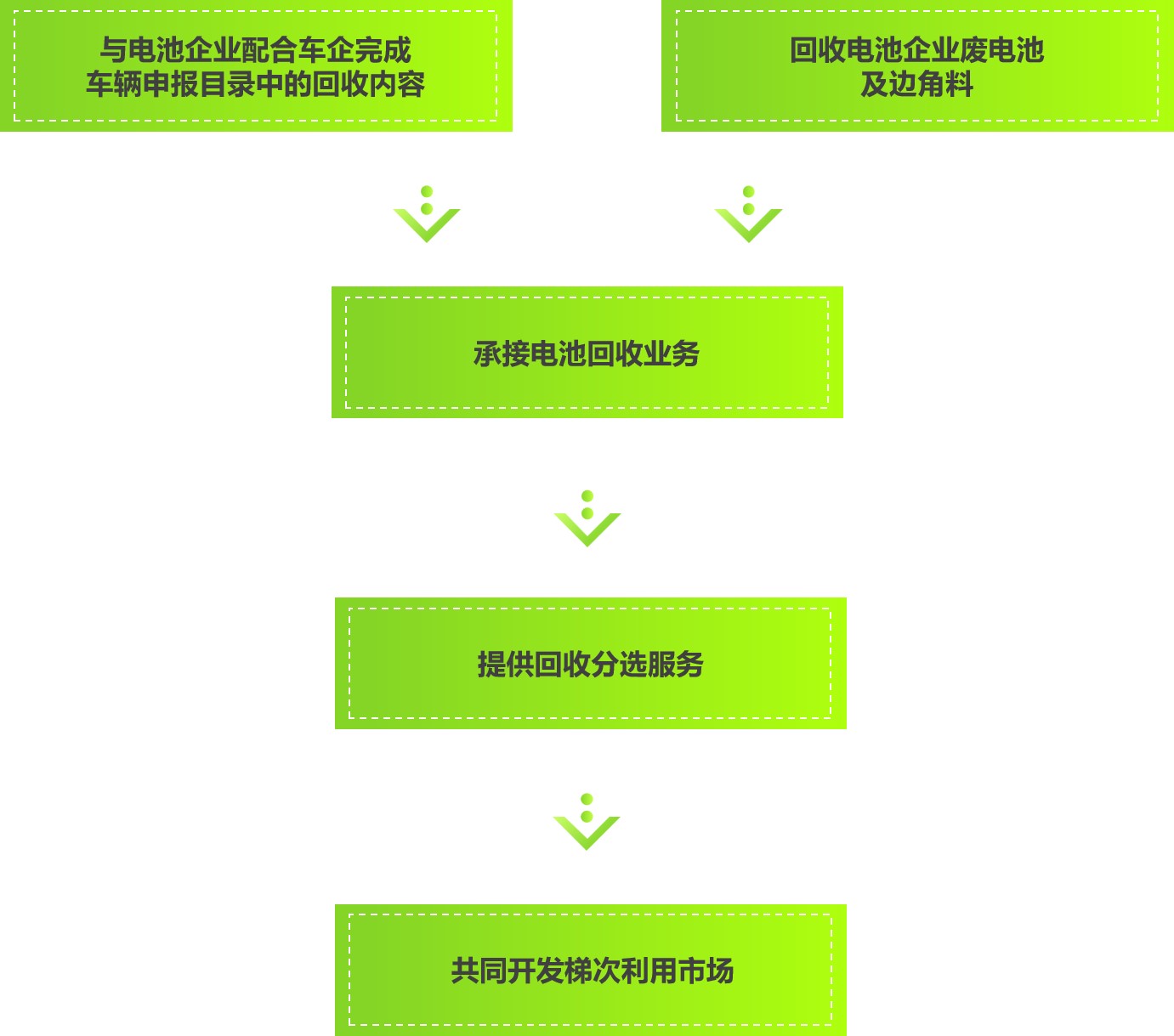 我們與汽車企業(yè)共同構(gòu)建回收服務(wù)網(wǎng)點(diǎn),通過網(wǎng)點(diǎn)回收?qǐng)?bào)廢、退役電池,建立電池溯源機(jī)制,落實(shí)好生產(chǎn)者責(zé)任延伸制,對(duì)回收的報(bào)廢、退役電池檢測(cè)分選,輕度報(bào)廢電池將應(yīng)用在儲(chǔ)能設(shè)備及低速電動(dòng)車,重度報(bào)廢電池則進(jìn)行拆解再生成電極材料及外殼包裝。